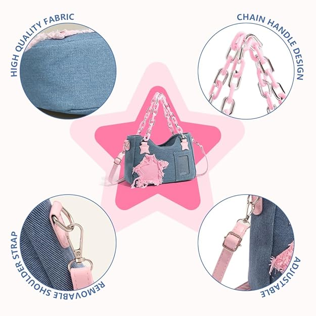 TRENDY Y2K DENIM FASHION HANDBAG: Experience a nostalgic yet modern accessory with this small tote, inspired by the stylish Y2K denim trend. The denim-style fabric, paired with playful pink star decorations, makes it a fun and fashionable choice for girls and women looking to showcase their personal style.